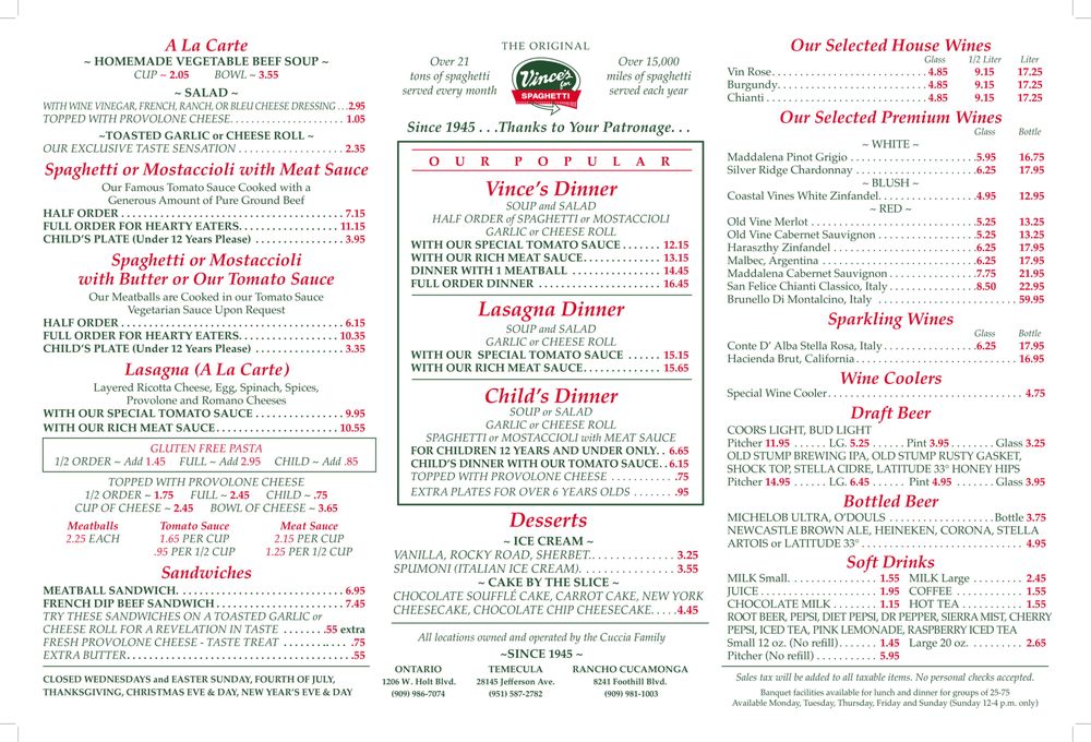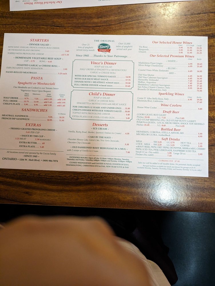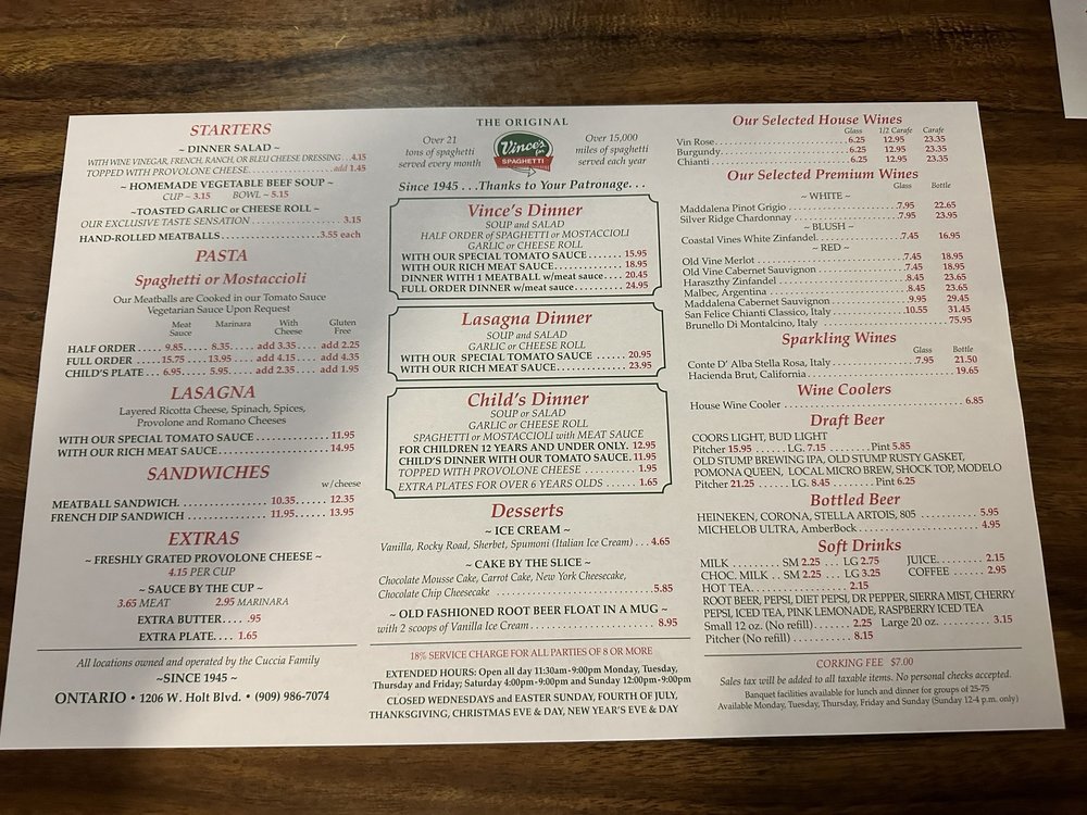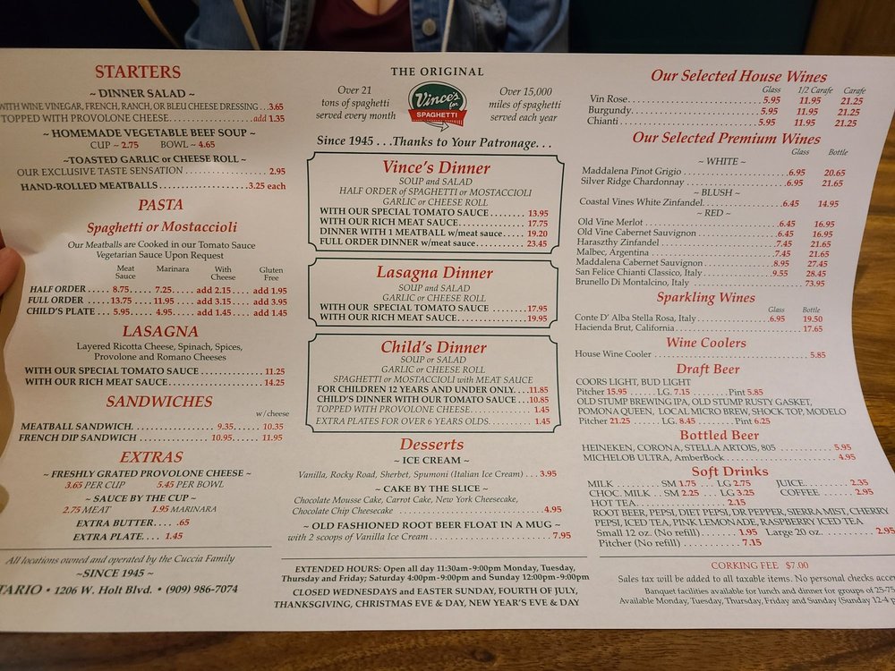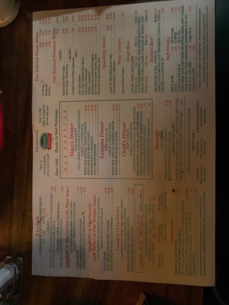 Introducing the menu at Vince’s Spaghetti in Ontario, CA: This family-owned Italian restaurant offers a cozy, nostalgic atmosphere with generous portions and friendly service. With a focus on traditional spaghetti dishes, including meat sauce and meatballs, the menu also features vegan and vegetarian options. Customers rave about the quality and value of the food, with standout dishes like the half order of spaghetti with meat sauce and the cheese-laden house salad. The restaurant's classic ambiance and attentive staff add to the dining experience, making it a must-visit spot for Italian food lovers. Don't miss their famous Vince's Dinner which includes soup, salad, bread, and a half portion of pasta. You'll leave Vince's Spaghetti satisfied and planning your next visit.