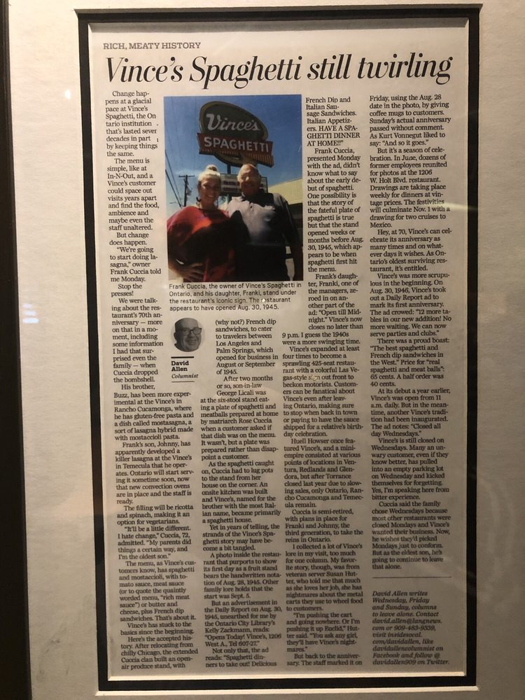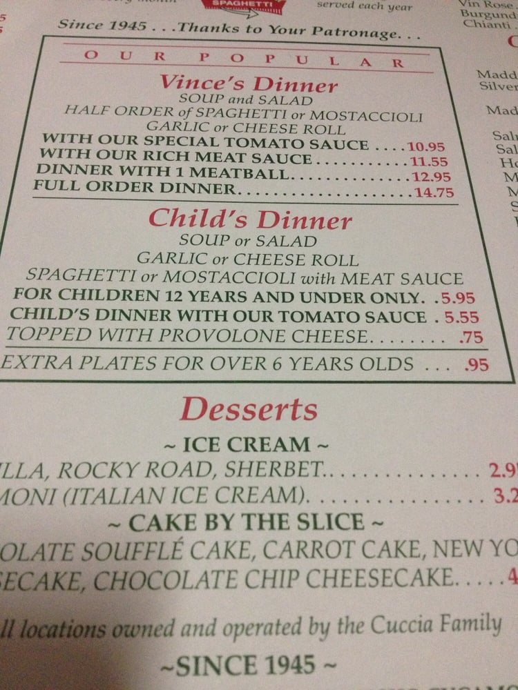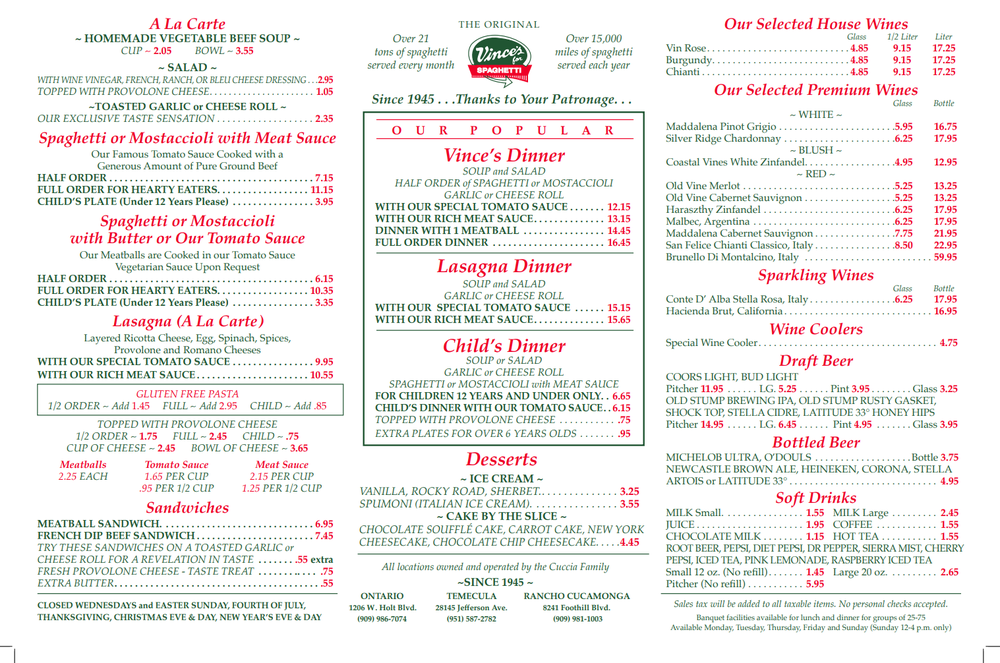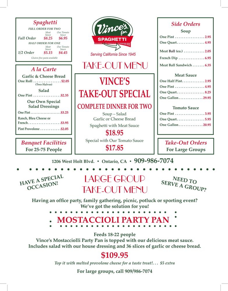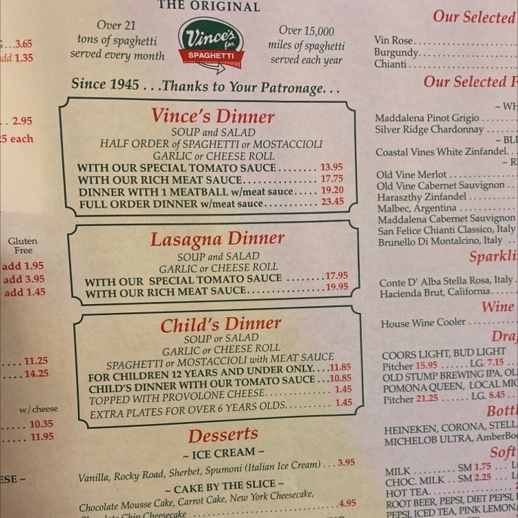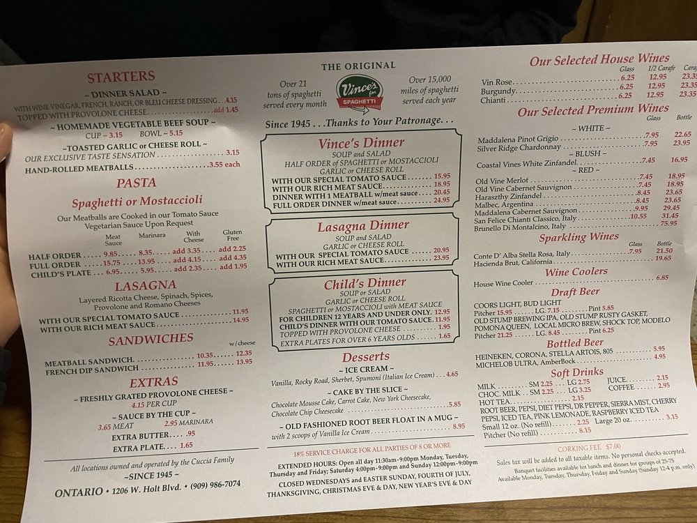 Introducing the menu at Vince’s Spaghetti in Ontario, CA: This family-owned Italian restaurant offers a cozy, nostalgic atmosphere with generous portions and friendly service. With a focus on traditional spaghetti dishes, including meat sauce and meatballs, the menu also features vegan and vegetarian options. Customers rave about the quality and value of the food, with standout dishes like the half order of spaghetti with meat sauce and the cheese-laden house salad. The restaurant's classic ambiance and attentive staff add to the dining experience, making it a must-visit spot for Italian food lovers. Don't miss their famous Vince's Dinner which includes soup, salad, bread, and a half portion of pasta. You'll leave Vince's Spaghetti satisfied and planning your next visit.
